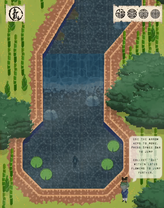 Dragon Gate is a top-down platformer following a koi carp scaling the Yellow River. The inspiration of the game is taken from Chinese tradition where silver carp swim upstream then leap the falls of the Yellow River at the Dragon Gate. They would then be transformed into a dragon after leaping into the sky.